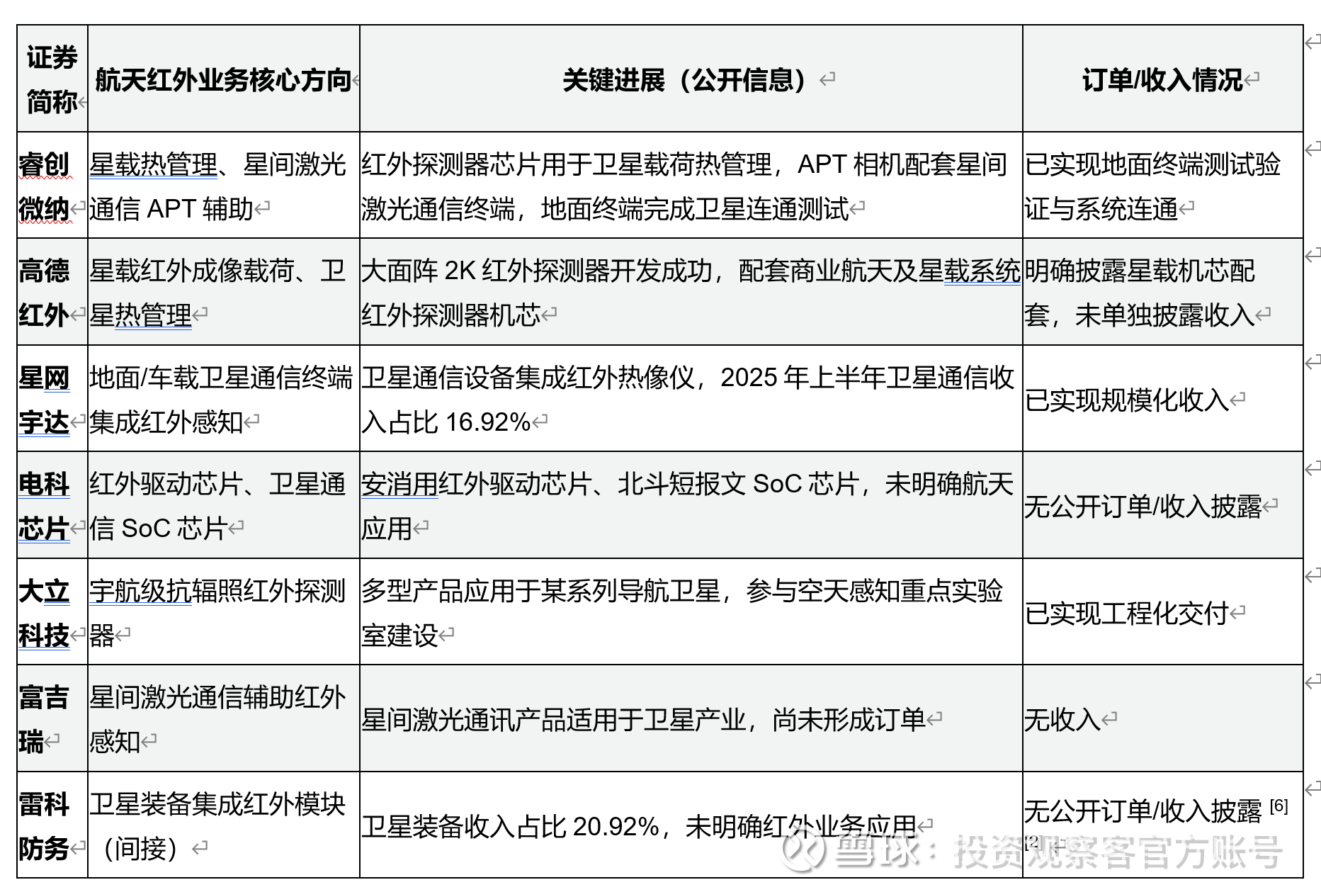 笔者稍微整理了一下具有红外业务公司且在行业航天领域有布局的公司,供读者参考。总体来看,部分公司只属于业务储备,也有公司实打实的有了业务订单的。按照业务进展及密切性可以大致分为三个梯队。