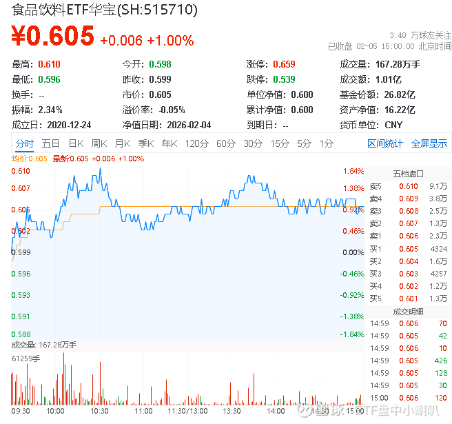 热门ETF方面,食品饮料ETF华宝(515710)场内价格上涨1.0%,成交额达1.01亿元。
