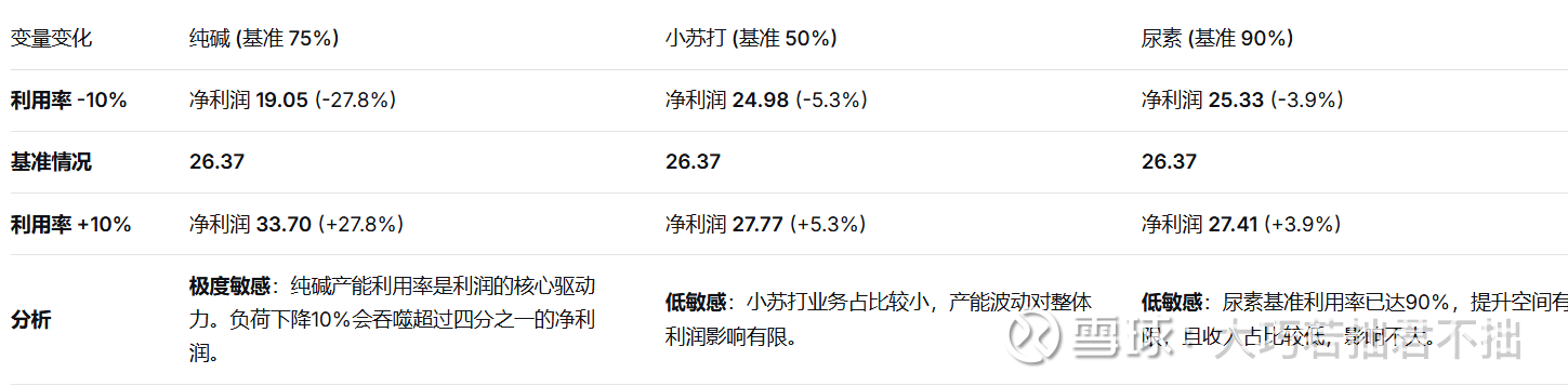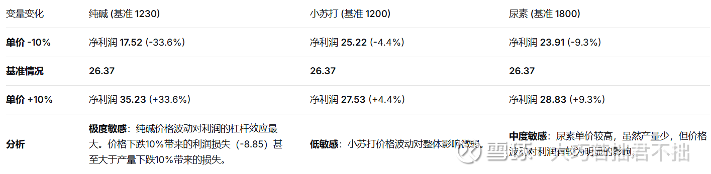 从敏感性分析来看,纯碱的产能利用率和纯碱的市场单价是影响净利润最核心的变量。考虑到纯碱业务在总收入中的占比超过67%,该产品的微小波动都会显著改变最终的盈利水平。