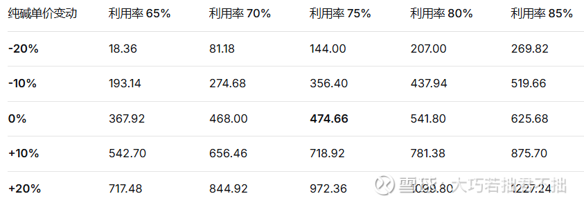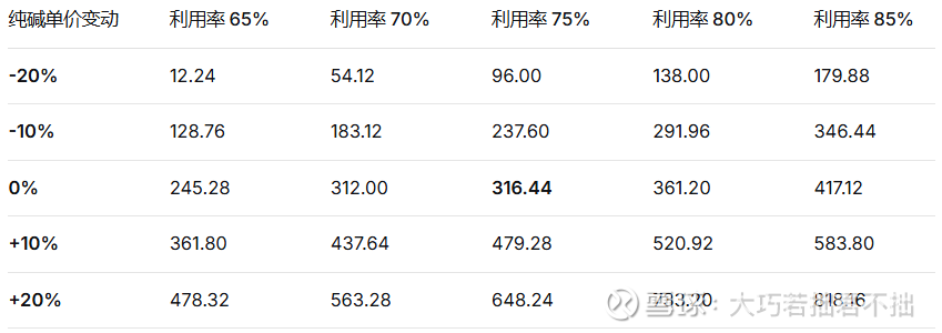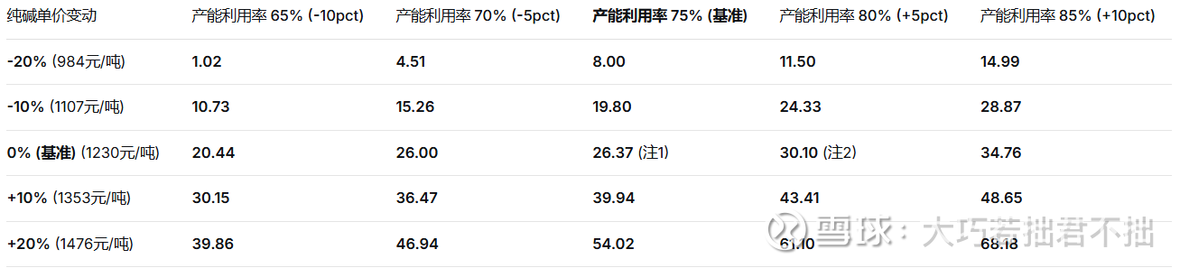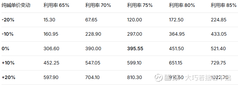 变量波动范围:纯碱单价变动从-20%至+20%,产能利用率变动从-10个百分点至+10个百分点(即65%至85%)。