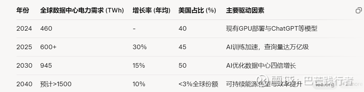 这一观点并非空穴来风。国际能源署(IEA)在2025年报告《Energy and AI》中预测,全球数据中心电力需求将从2024年的约460 TWh翻倍至2030年的945 TWh,相当于日本全年用电量。 在美国,数据中心将驱动近50%的电力需求增长。 马斯克的xAI公司已开始使用天然气涡轮机为其Colossus数据中心供电,这也凸显了短期内对可靠能源的迫切需求。