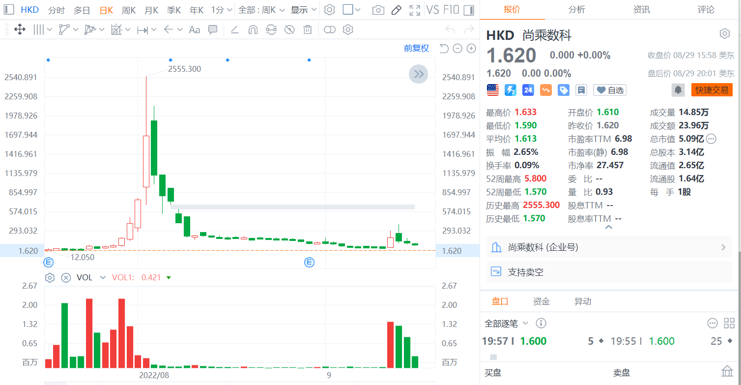 寒武纪怎么敌不过2022年的尚乘数科?当年的美股尚乘数科(中概股),在短短的几天内暴涨了200倍,市值好像是涨到了多少几千亿美元的位置。
