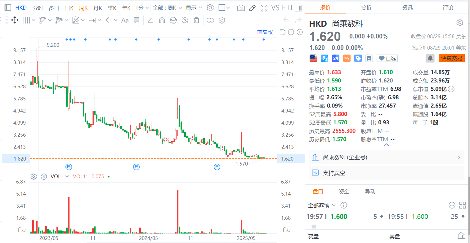 按他们的天真的想法,尚乘数科是满足了他们的要求的,它有无数次的一天暴涨……但其实呀,一旦暴涨过后,又必定会继续创新低。他们的抄底,想一想,这从2500元跌到1.6元,大概是腰斩了10.5次,即一共跌了10.5次50%才能跌到当前的股价。究竟这种遥控骰子什么时候涨,什么时候跌?这就看散户有没有上当,有没有人跟它们对赌了。