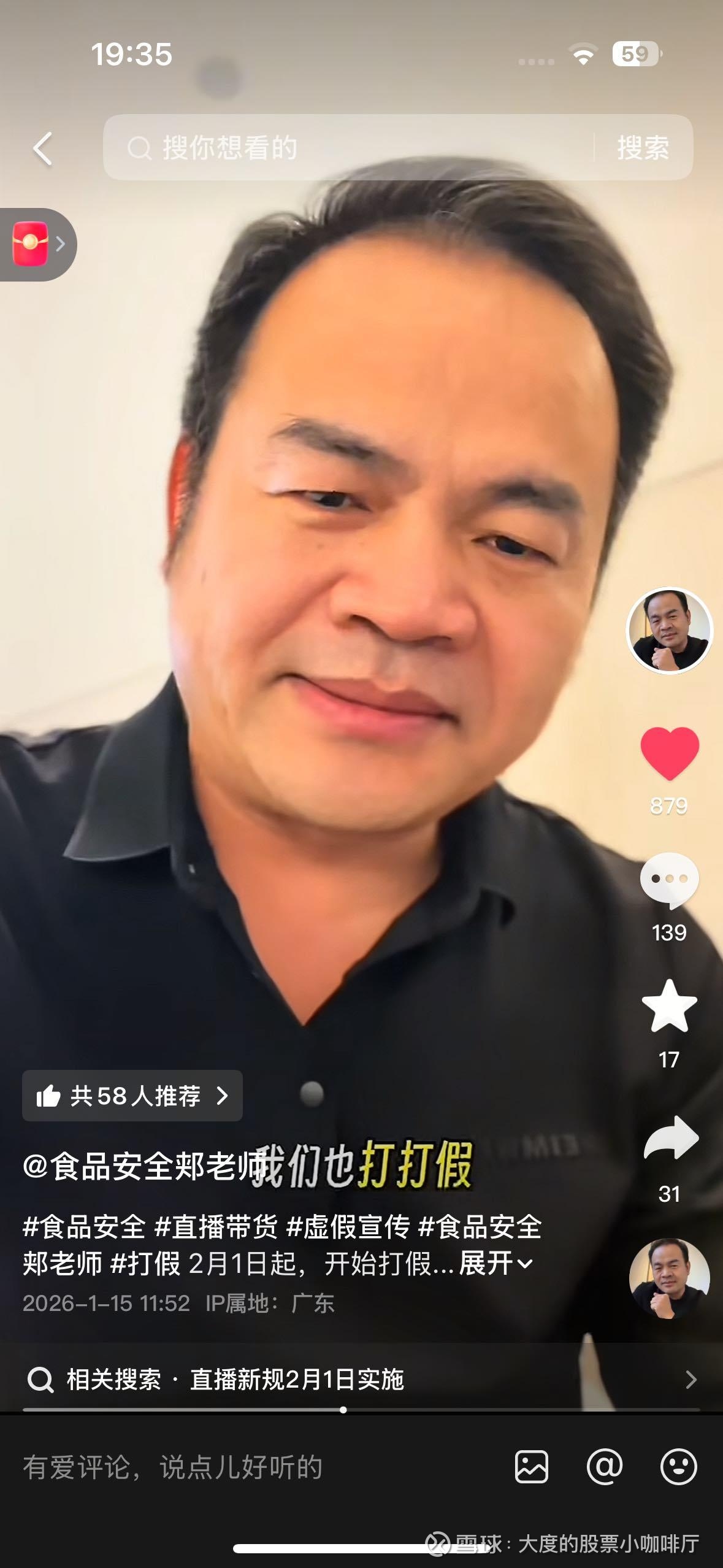 $东方甄选(01797)$ 原央视食品安全著名记者郏老师,曾揭露多起食品安全问题事件,例如瘦肉精,红心鸭蛋,毒胶囊等多起重大食品安全事件,今天发视频说,二月一号电商法规生效过后,会盯着与辉同形,来打假一波与辉同形,他一直不希望出现劣币驱逐良币现象,我觉得现在越来越多人开始发现与辉同形的问题所在了