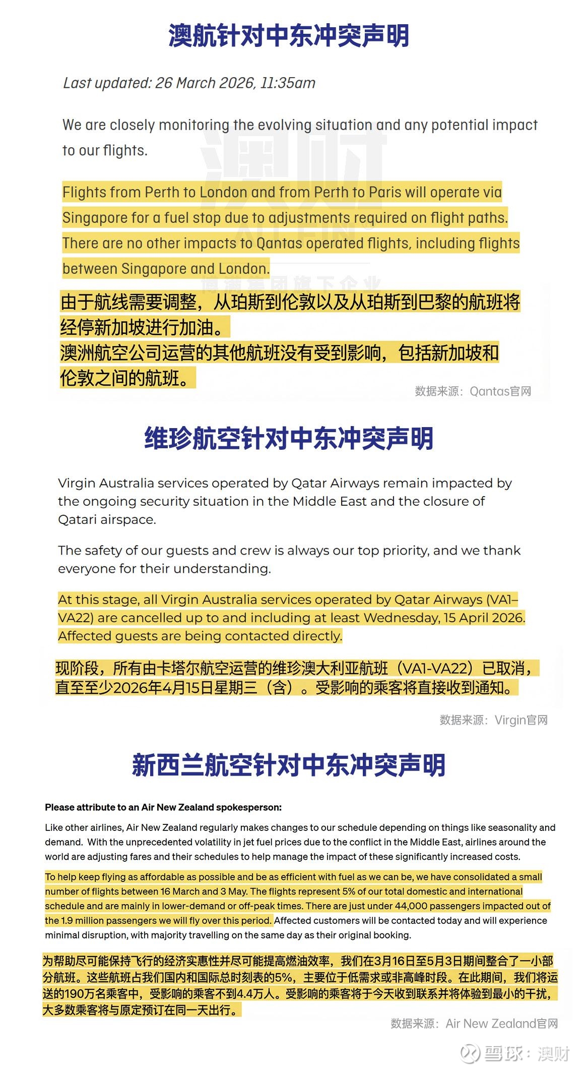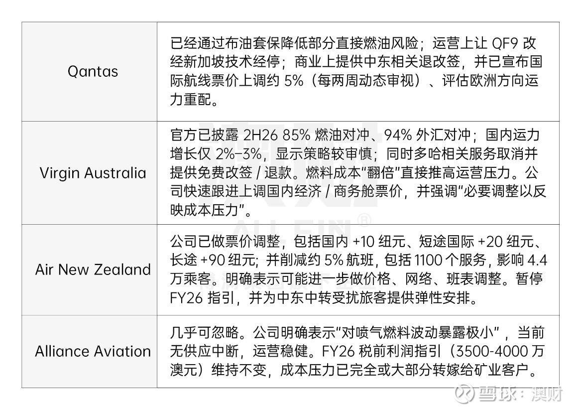 针对中东局势影响: 3 月 10 日,Air NZ直接宣布暂停 FY2026 指引,原因就是中东升级导致航煤市场“前所未有”的波动;同时明确已实施初步票价调整,并表示可能还需要进一步做票价、网络和班表调整。随后公司又披露,3 月 16 日至 5 月 3 日之间将整合约 5% 的航班班表,影响不到 4.4 万名旅客,并为经中东中转的合作伙伴航班提供改签和信用额度安排。