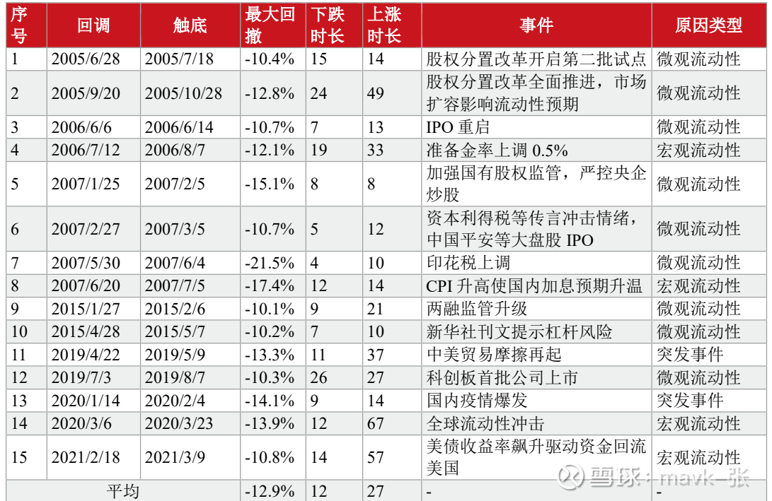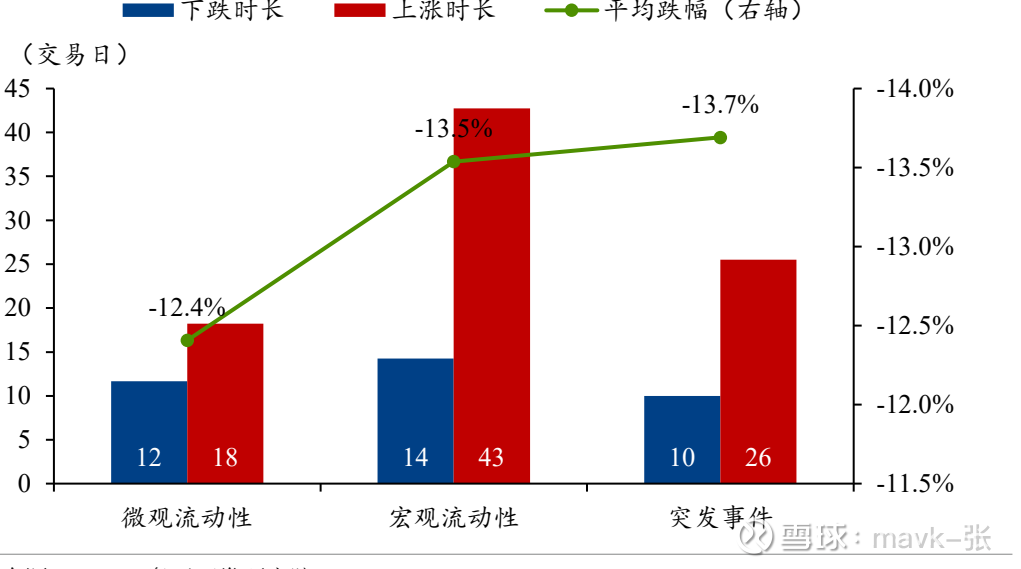 由微观流动性收紧引发的回调,其后的反 弹速度最为迅速;而由宏观流动性转向所导致的下行,其市场修复过程则往往最为缓慢 和曲折。三类原因所致大级别回调的下跌时长相近,但后续回升至初始点位的时长各不 相同。微观流动性收紧所致的回调平均下跌 12 个交易日,平均跌幅为 12.4%,触底后 涨回初始点位需要 18 个交易日;宏观流动性收紧所致的平均下跌 14 个交易日,最大跌幅 13.5%,涨回初始位置需要 43 个交易日;突发事件所致的平均下跌 10 个交易日,最大跌幅为 13.7%,触底后回升平均需要 26 个交易日。
