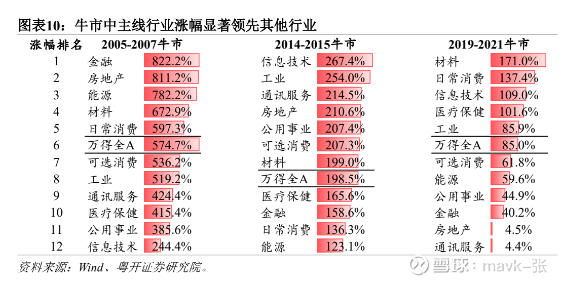 另一方面,工业化、城镇化进程加速,带动煤炭、有色、房地产行业繁荣,出现了 “煤飞色舞”行情,以及地产股价格的飙升。 尽管牛市演绎过程中,消费股曾在 2006 年上半年阶段性领涨市场,但随后又再度切换为金融、能源等板块。其余几轮牛市的情 况也大致相同,都有一条符合时代背景的主线贯穿始终。2014-2015 年牛市主线是“互 联网金融”;2019-2021 年牛市主线是“核心资产”, 食品饮料和电力设备交替上涨,“茅 指数”和“宁组合”共舞。 也就是说,牛市行情从几个核心板块开始发动,中途可能会切换到其他板块,但最后又会回归到核心板块;这几个核心板块就是牛市的主线行情,牛市期间的胜率和赔率 均领先其他板块。