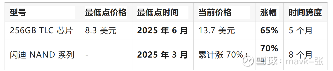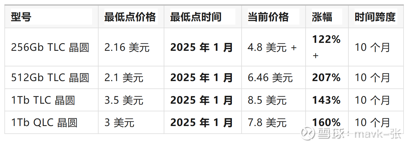 NAND 晶圆: 512Gb TLC 涨幅 207%(最低点: 2025 年 1 月)