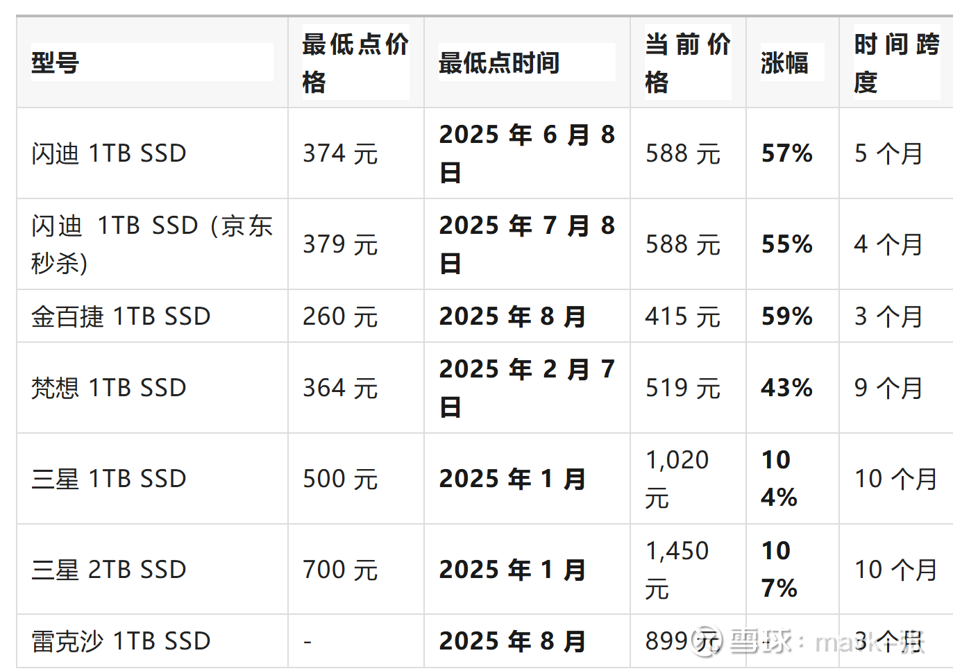 SSD: 主流品牌涨幅 40-100%(最低点: 2025 年 1-8 月)