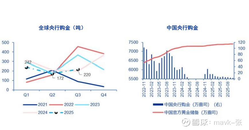 • 2025Q3全球央行购金220吨,环比Q2增加48吨;中国央行连续12个月购金,截至10月末中国黄金官方储备为7409万盎司。