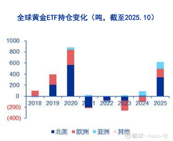 截至2025年10月全球黄金ETF净流入619吨(滚动1年持仓变化473吨低于2020年峰值1070吨)持仓量3893吨,突破2022年4月高点。