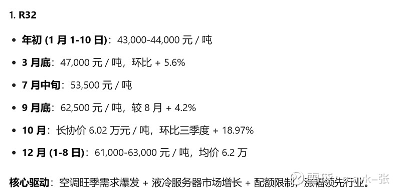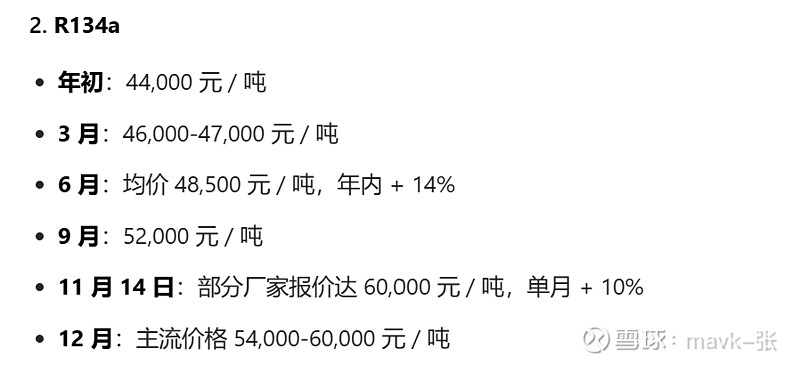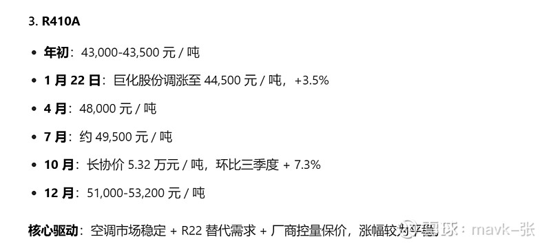 配额政策:三代制冷剂 (R32/R134a/R410A/R125) 配额固定,供需趋紧;R22 配额大幅缩减,加速淘汰