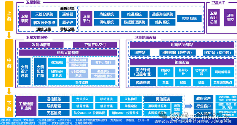 上游为卫星制造及卫星AIT,包括卫星平台、卫星有效载荷和卫星整星制造;