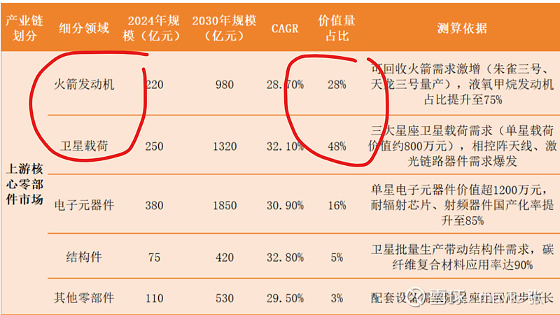 上游最有价值环节是:火箭发动机、卫星载荷,