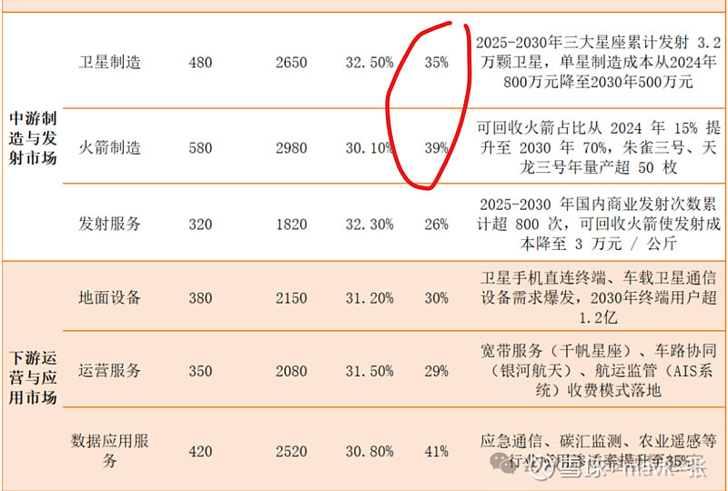卫星制造:2025-2030 年 CAGR 达 32.5%,核心驱动力为三大星座 3.2 万颗卫星的集中发射需求,嘉兴、天津等智能化产线投产后,单星制造成本下降 40%,进一步刺激市场化订单增长。