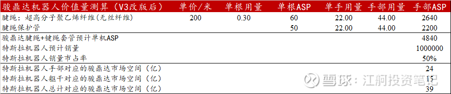 2. 报价和用量:第三轮测试与询价同步进行,25/26年分别3.2/110万根,按双手34根腱绳计算,分别对应1700台/3.2万台机器人;报价200元/根,年内有望落地大规模订单; 单手一个自由度对应一根健绳,200元一米。有接触到机器人身体架构使用健绳的需求,如情绪机器人全身用量健绳ASP约5000元左右。