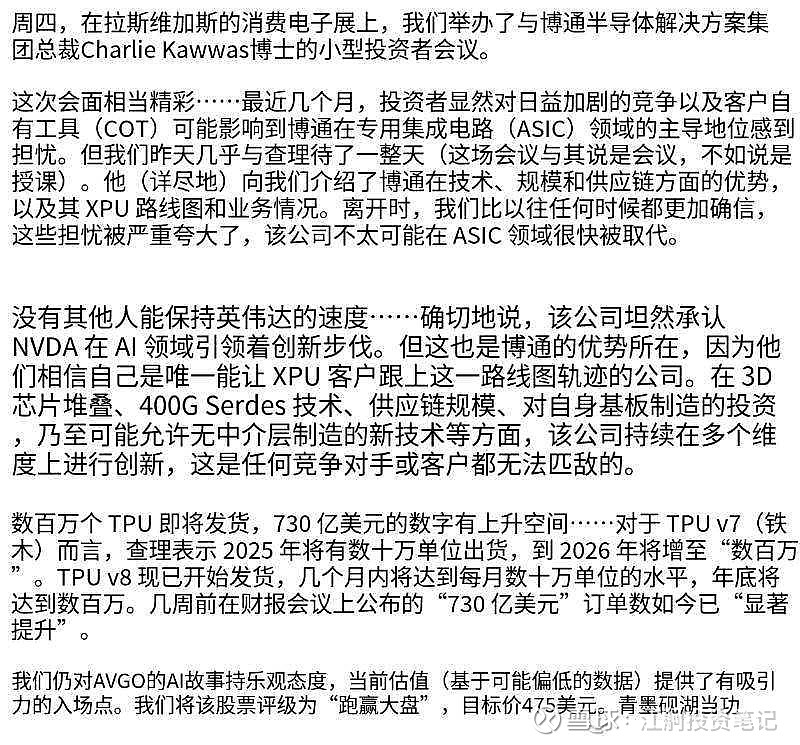 $胜宏科技(SZ300476)$ $沪电股份(SZ002463)$ $博通(AVGO)$博通纪要显示,谷歌TPU V8已出货,且表示比较积极,之前谷歌TPU出货预期,26年400-500万,其中v7预计200-300万,V8E(推理)30万,V8P(训练)50万,其中一半为HDI(胜宏),一半为高多层(沪电),27年预计为650-800万单位出货。