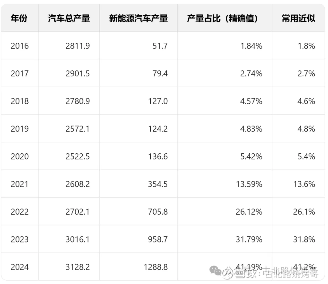 却完全忽略了在2016年(十三五开局之年)出台了大批量的新能源政策,然后出现了超大规模的新能源骗补,新能源车技术逐步开始成熟,渗透率从1%开始走起来了(2016年新能源车的出厂占比1.8%)。