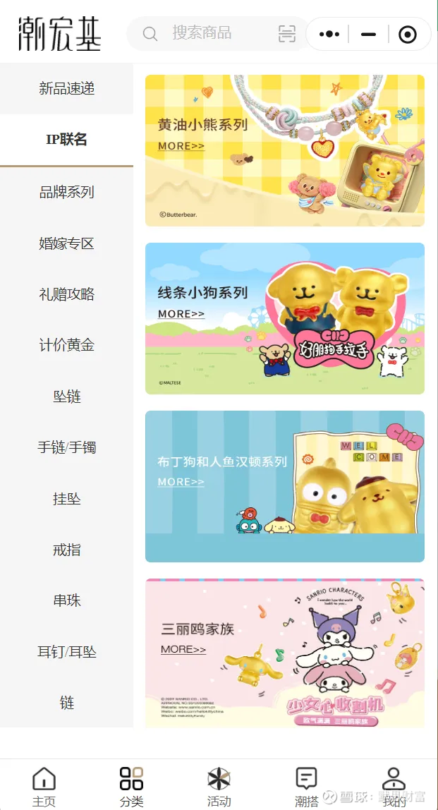 近年来,随着黄金工艺的革新与设计创新的驱动,年轻消费群体对时尚珠宝的需求显著增长,珠宝的悦己属性也日益凸显。潮宏基作为全品类的珠宝品牌,不断丰富自身的产品品类,推出了联名流行IP的首饰等产品,精准地捕捉了年轻消费者的审美偏好,满足不同消费者群体的个性化需求。此外,潮宏基还将花丝镶嵌工艺与流行IP相结合,借助流行IP的强大市场影响力与粉丝基础,打造具有差异化竞争优势的产品。