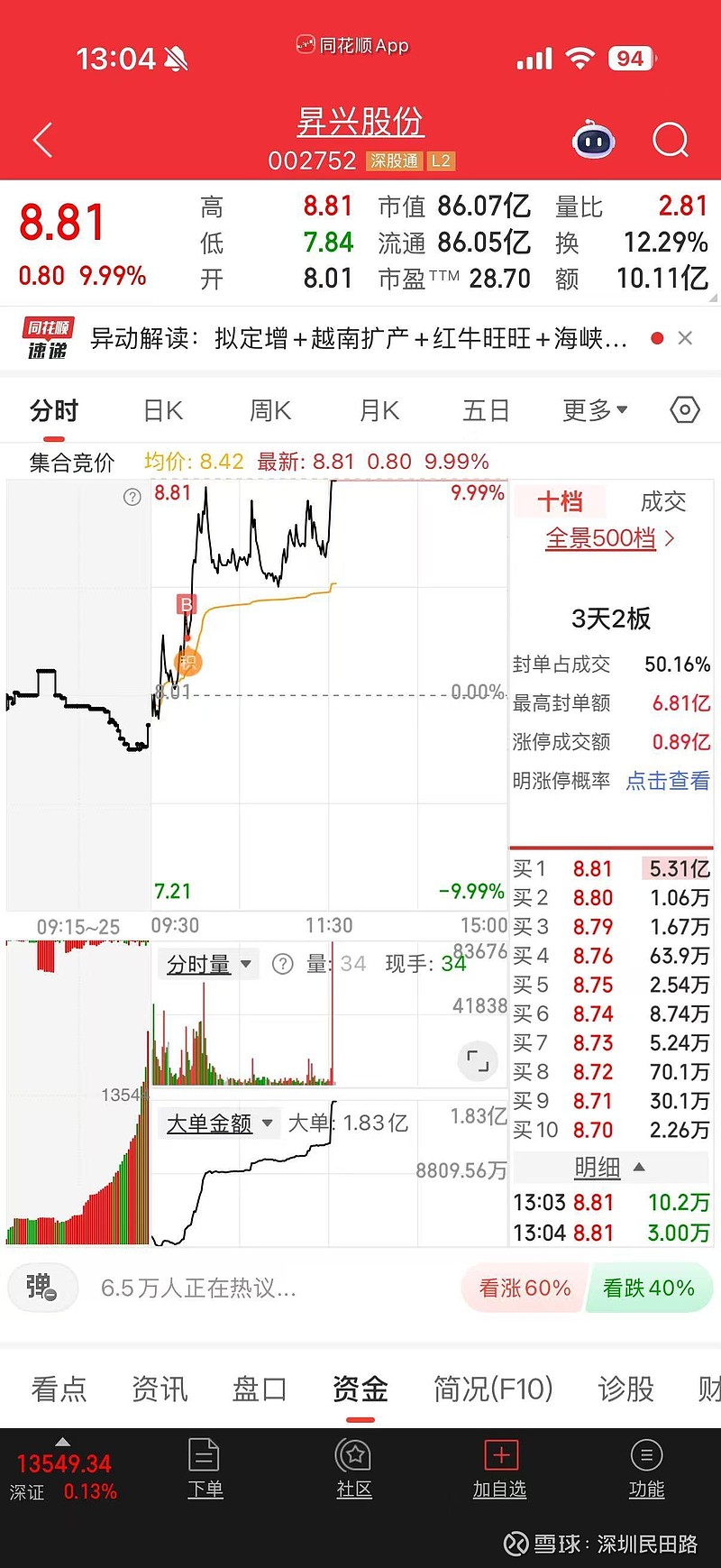 今天鹭燕$鹭燕医药(SZ002788)$ 没动,没有给很好的加仓机会,那就继续持股;昇兴股份$昇兴股份(SZ002752)$ 今天顶着概念龙头合兴跌停反馈走强,那就继续跟随加仓,盘口也能明显看出有大资金在吃货,下午开盘也是直接涨停,今天组合才想起来调整,刚好调整完就涨停了;国晟昨天续监管,那最近又是低吸高抛的节奏了;不得不说,这个月行情是真好,看看能不能冲一下翻倍收益