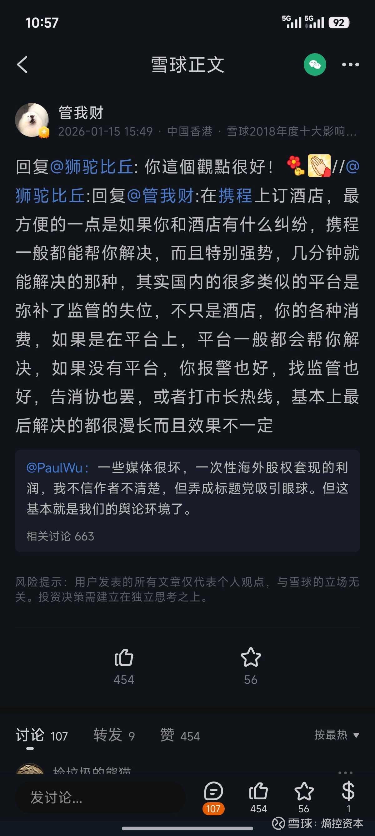 //@熵控资本:回复@管我财:没想到这个回旋镖这么快就打到了自己身上。春节期间换民宿遇到了“挂羊头卖狗肉”的店家,而我们到了现场才发现,订单已经是不可取消的状态,后面通过携程人工客服的介入,几次沟通后进行了全额退款。全程大概十几分钟,平台的强势展示的淋漓尽致。给携程点赞。