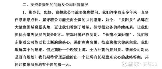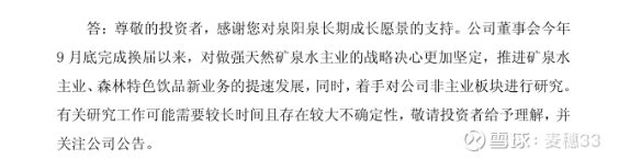 投资者关切与公司回应:针对股东关于剥离亏损业务、聚焦大健康主业的诉求,公司表示换届后做强矿泉水主业的决心更加坚定,正推进主业及森林特色饮品业务提速,同时已启动非主业板块研究,相关工作因复杂性存在不确定性,具体进展需关注公司公告。
