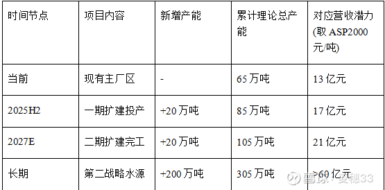 根据公司公告及募投计划,产能爬坡路径清晰,2027年将迈入百万吨产能行列,长期第二战略水源有望支撑超300万吨产能,为全国化扩张奠定基础: