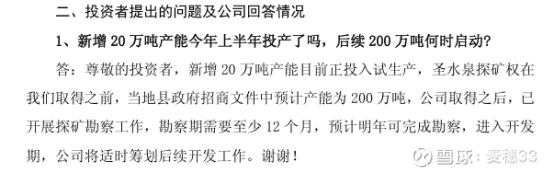 产能进展回应:公司新增20万吨产能已进入试生产阶段;第二战略水源圣水泉探矿权已完成获取,勘察期至少12个月,预计次年完成勘察并进入开发期,后续产能开发将适时推进。