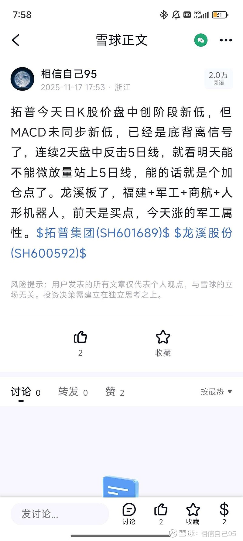 $龙溪股份(SH600592)$ 龙溪是T链机器人滑动轴承的供应商,7-9月做过一轮,属于股性很好的票。由于一直在跟踪T链,11月17号那天复盘,就看到龙溪13日那天的长下影线基本探出了短期底部,当时特意记录了下。最近由于福建和商航的强势,以及机器人不断的消息催化,导致龙溪也持续走强。周五属于突破后进行回踩确认,后续如果有调整,还是找进场的机会。