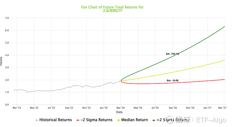 根据Algo-Chain对未来预测,工业母机ETF中性情境下,预计6-12个月回报率约达到30-85%;乐观情形(+2Sigma,95%置信上限)预计6个月之后总回报率达到104.4%;悲观情形(-2Sigma,95%置信下限)预计6个月后总回报率为-8.4%。