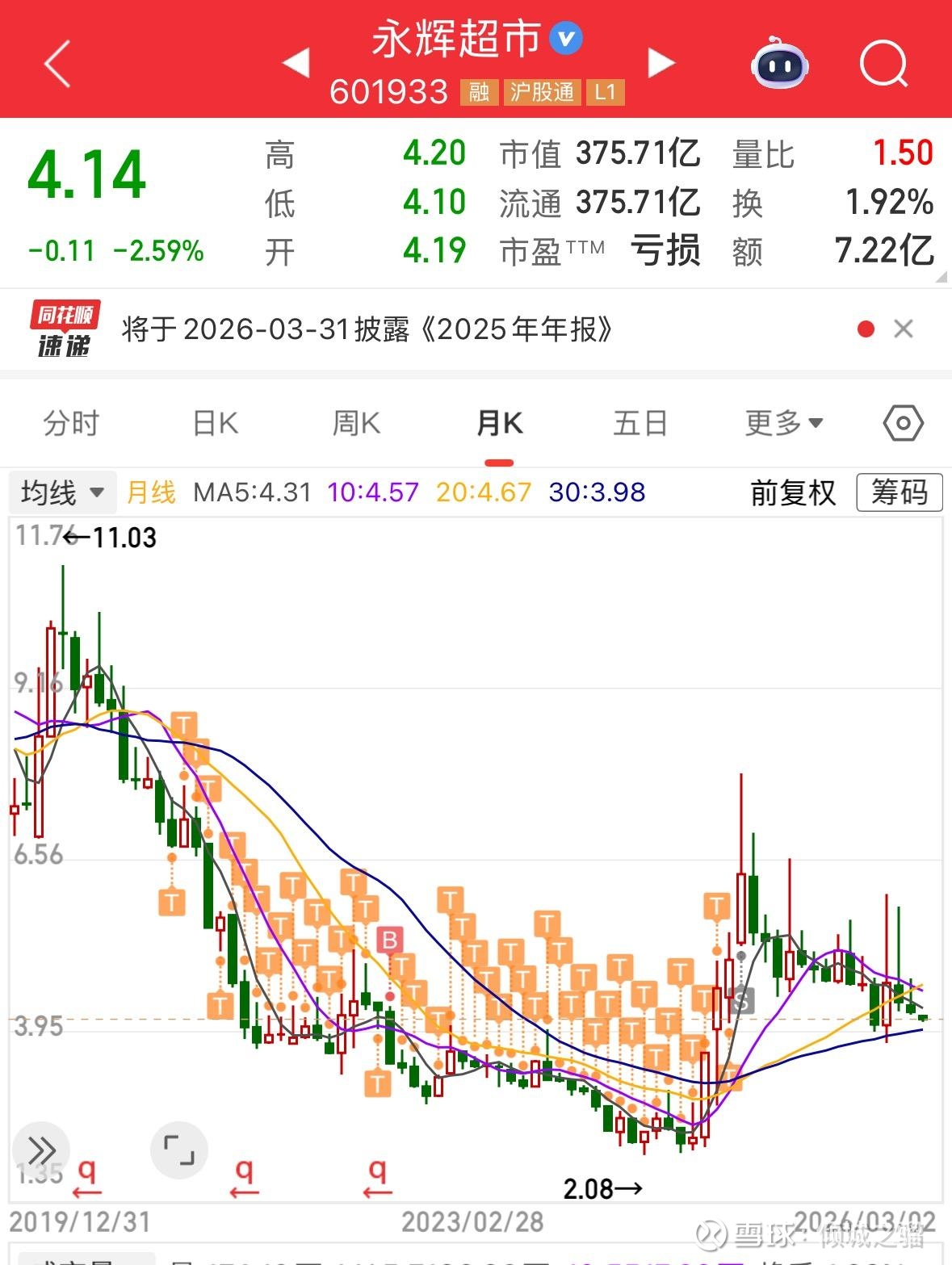 7块多建仓,最低跌到2.08,最高跌幅接近75%,这段时间的痛真的刻骨铭心,这段时间我的公司业务慢慢还不行了,然后还被永辉深度套牢(此处要感谢我的老婆,她给我提供了源源不断的支持,她凭借一己之力,撑起了整个家),但是我依然没有投降,我还是一路做T,就这样一点点降低成本,所以最终尽管清仓点没有比我建仓点翻倍,但是我依然翻倍了。