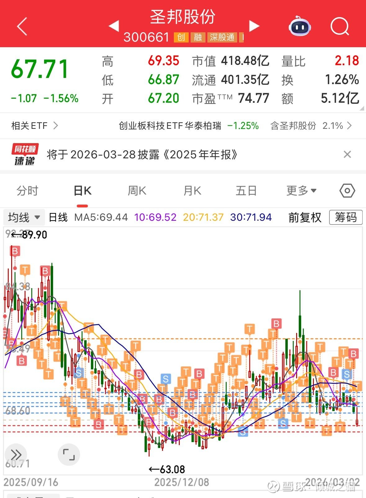 不过圣邦的下跌比起之前,真的不算什么了,这点下跌根本引起不了我的任何痛感,我在反弹前69.9的价格卖掉了一些,没有遵循自己的系统(幸好又被我买回来了,让我交易系统又重新完整了),这是未来一定要戒掉的坏习惯,不要预测股价。