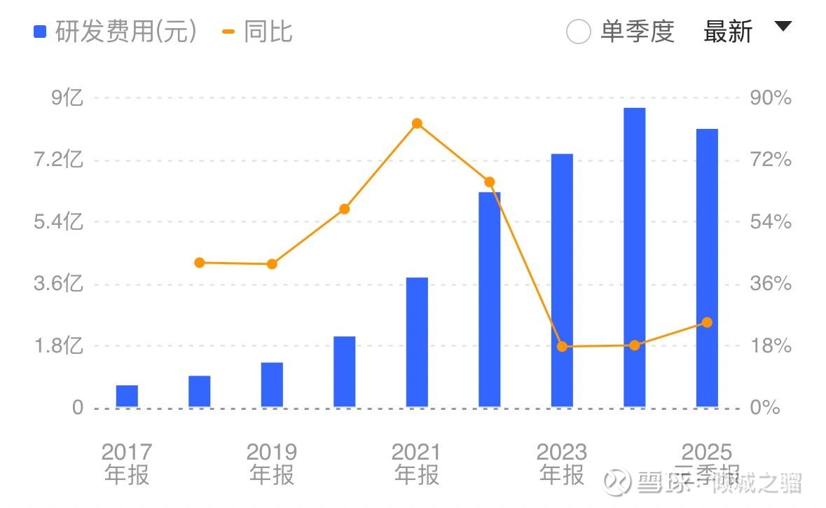 首先,我们把目光重新聚焦到圣邦股份的研发费用,2020年之前,研发费用和业绩的增长基本匹配,但是从2021年开始,突然开始跳长,由2020年的2.07亿直接跳到了3.7亿,随后开启了直达今天的巨幅增加,20223年为7.37亿,2024年8.7亿,2025年还在增加,相当于5年的时间研发费用翻了4倍,但是营收和利润并没有翻4倍。