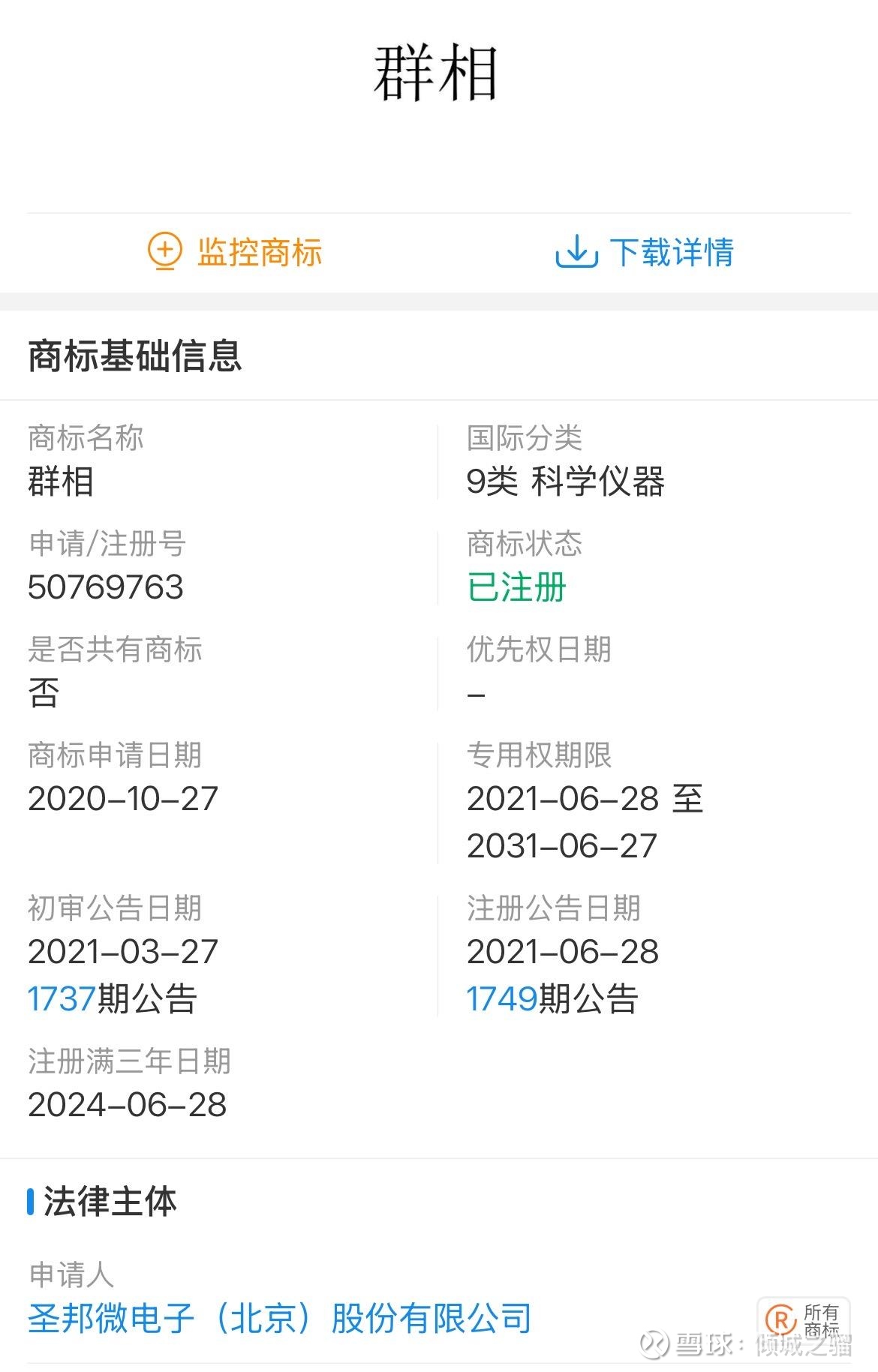 2020年10月27年,圣邦股份注册了群相商标(英文商标为MASSIVEPHASE),这个商标几乎覆盖了他所从事的模拟芯片领域。