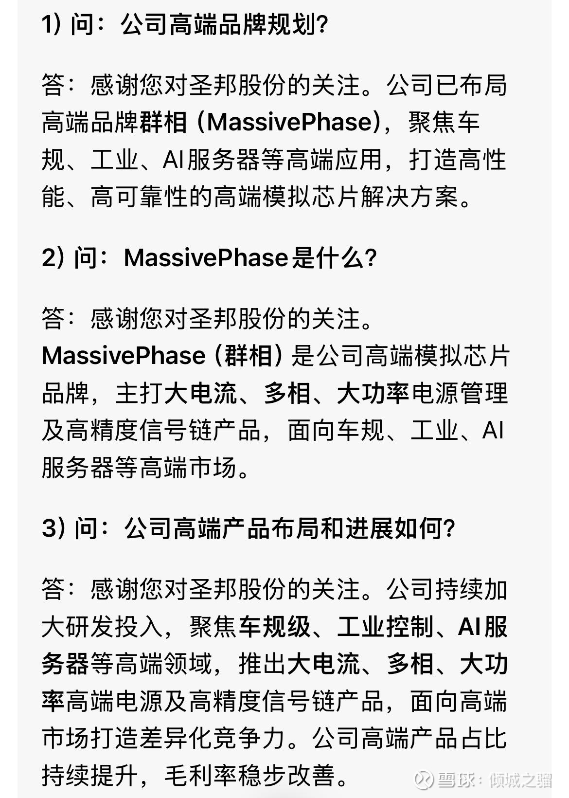 群相虽然作为一个独立品牌,没有自己的官网、公众号等信息,只是圣邦微旗下的独立品牌,但是通过研报、公司介绍、展会信息,我们可以清晰地看到圣邦股份对群相的定义就是高端模拟,主要聚焦高端工业、车规、AI服务器等高端产品线,并且拥有独立的研发、销售体系。