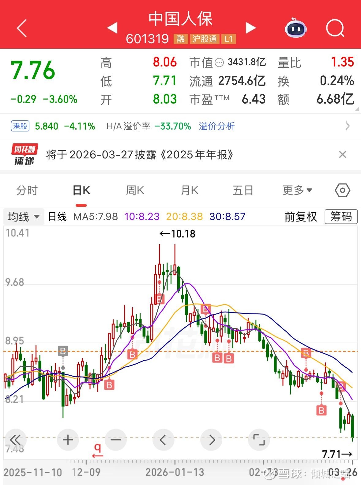 而只买不卖的话,股价越低越好,除了最开始的一段时间,股价涨了20%,让我后续的买入成本偏高,但是随后一路下跌,来到了可以让我最舒服的状态,我可以以更便宜的价格囤积更多的中国人保股票。