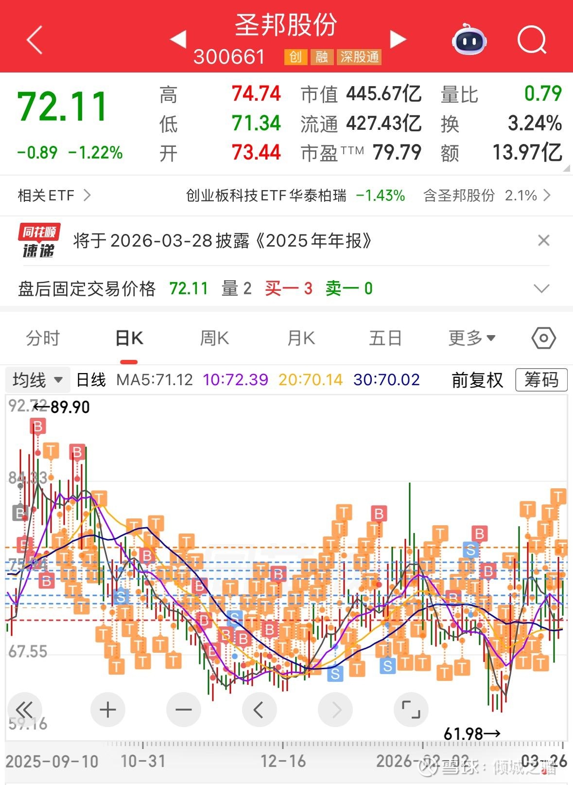 从2025年9月15日买入,五个交易日,完成建仓动作后,我给圣邦股份设计的策略就是高抛低吸,所以从2025年9月份开始,我开始了在圣邦股份长达120多个交易的做T。