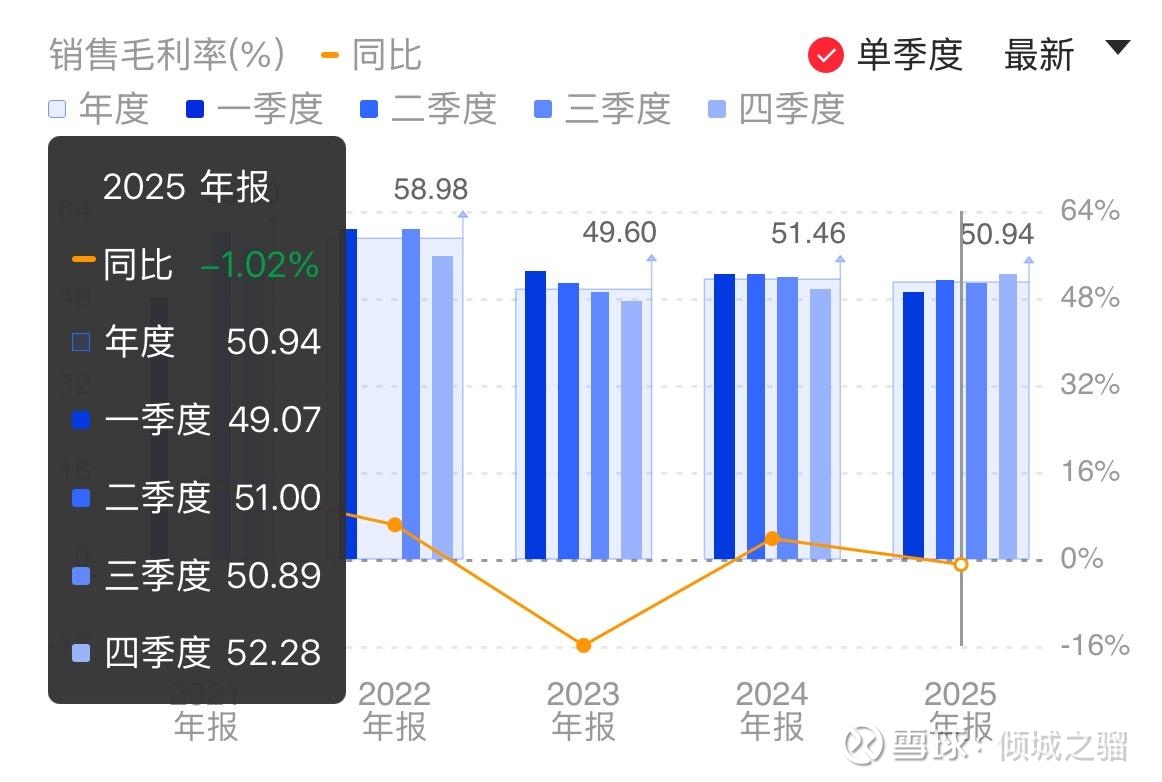 我们拉出分季度的毛利率,非常明显得看到2025年Q4毛利率已经来到了52.28%,为2025年全年最高。也正是单季度超过52%的毛利率,将2025年全年的毛利率控制在了50%以上,如果看毛利率大于50%这单一指标,其实在A股是非常少见的,能够多年保持这一水准,就难上加难,属于稀缺品种了。