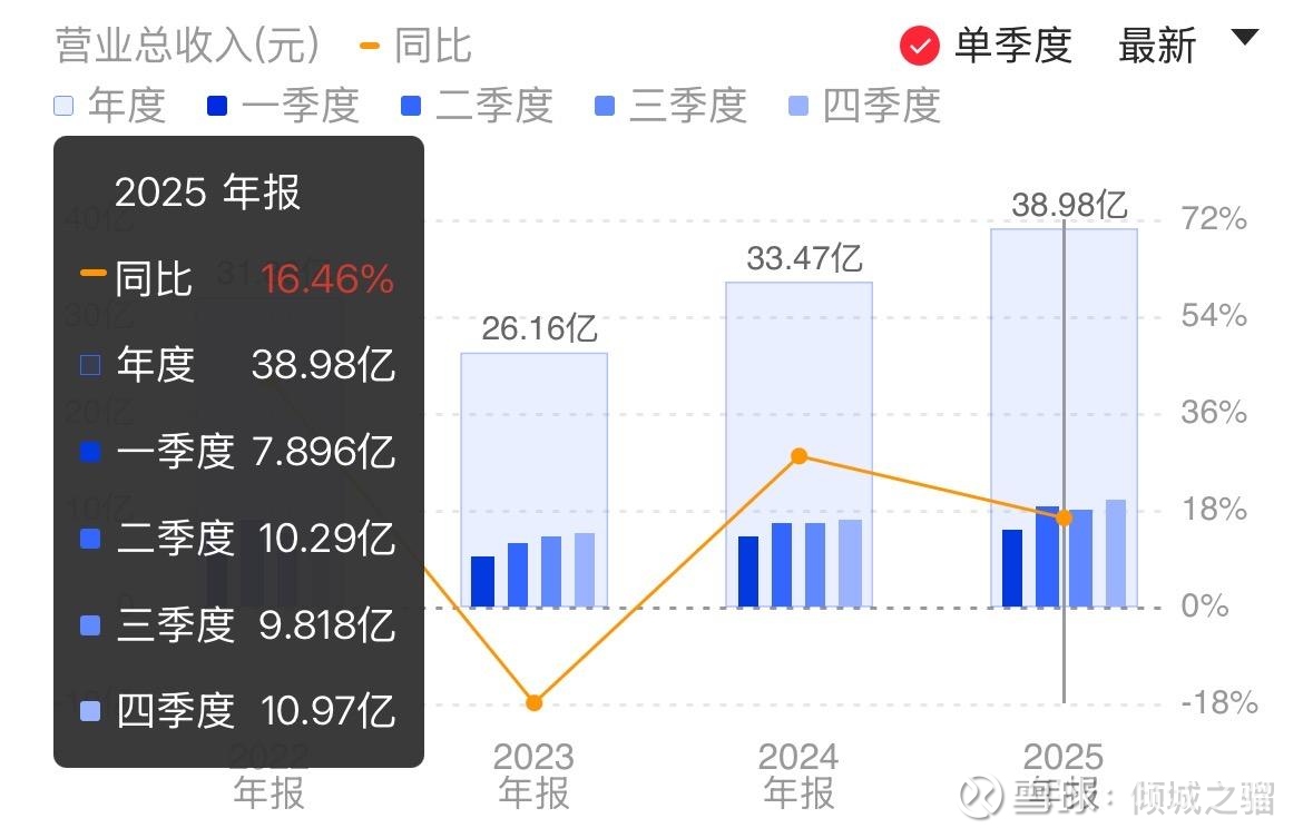 2025年全年营收为38.98亿,拆分到每个季度,2025年2、3、4季度分别是圣邦股份上市以来营收最高的前三个季度,2025年4季度为历史最高10.97亿。