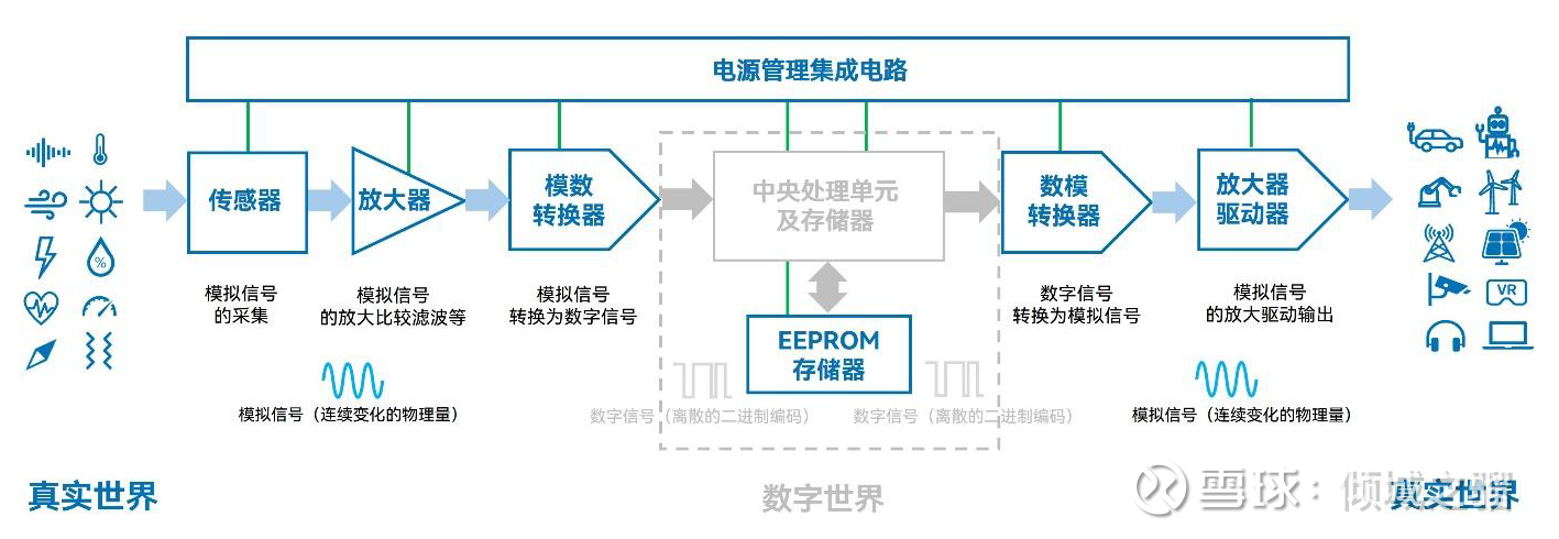 在财报中,圣邦股份用下图展示了公司的产品,最上层是电源管理集成电路,连接真实世界的是传感器、放大器和模数转换器,在数字世界里,圣邦股份新增了存储器产品,最右侧是数模转换器、放大器和驱动器。