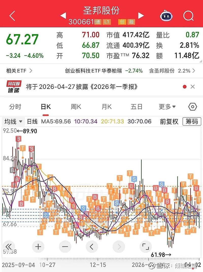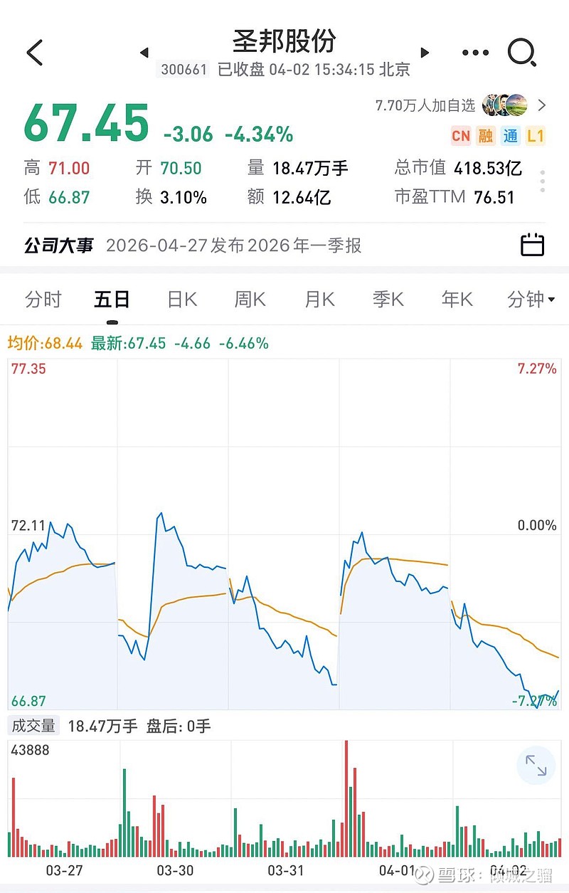 2026年4月2日,圣邦股份连续三天股价不是上涨4个点以上,就是下跌4个点以上,波动在进一步剧烈,很多人这几天可能不是狂喜就是狂悲吧,今天我想特别告诉我自己和有缘看到我这段文字的人:不要做股价的奴隶,因为只有股价的奴隶,才会根据走势做决策。