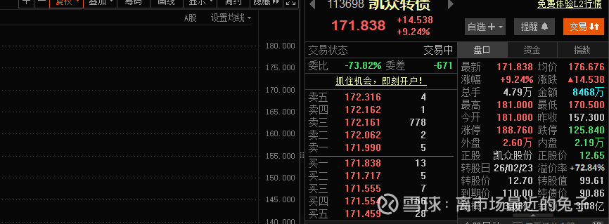 凯众转债:昨日以130的价格开盘,尾盘触及157.3的高位,今日开盘继续大涨15%,触及181的高位,到达预定目标价,单签获利800大洋,恭喜持有的DD吃肉,记得止盈离场。