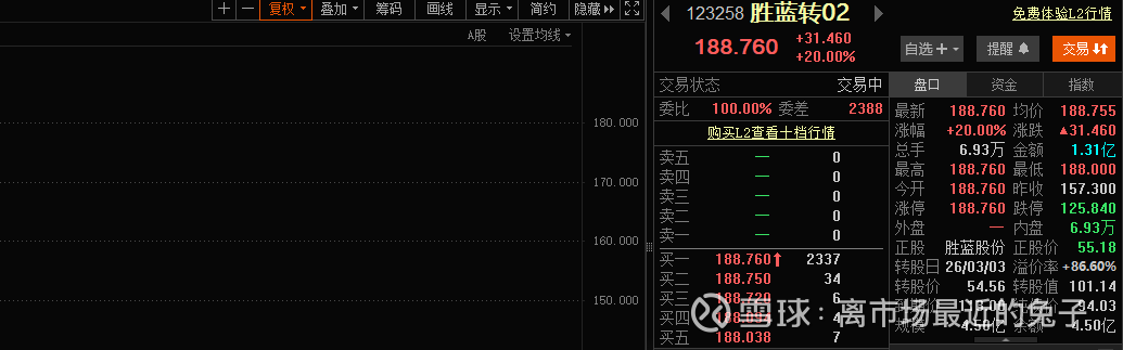 胜蓝转02:昨日以130的价格开盘,尾盘触及157.3的高位,今日开盘继续大涨20%,触及188的高位,单签获利880大洋,恭喜持有的DD吃肉,记得止盈离场。
