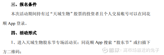 本次活动期间持有过“天域生物”股票,并且个人交易账号可以在同花顺 App 登录的投资者,可以通过同花顺搜索“股东节”,点击天域生物活动页报名,进行股东验证,等待开奖机会,