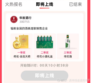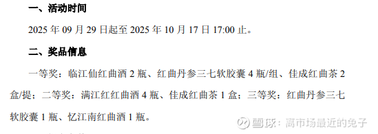 活动设置一等奖:临江仙红曲酒 2 瓶、红曲丹参三七软胶囊4 瓶/组;二等奖:满江红红曲酒 4 瓶、佳成红曲茶 1 盒;三等奖:红曲丹参三七软胶囊 1 瓶、忆江南红曲酒 1 瓶,感兴趣的DD记得参与。