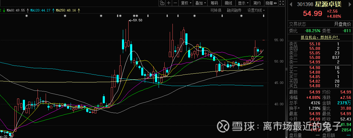 星源卓镁总股本仅有1.15亿,股性十分活跃,虽然在抢权配售资金推动下,今日出现较大幅度的高开,恭喜持有的DD吃肉,但KDJ指标处于高位,有回调的动力,以申购为主。
