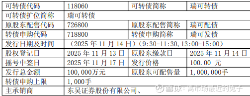 瑞可转债:11月14日申购+配售,转债信用评级AA-,六年到期本息合计115.7,纯债价值91.7。