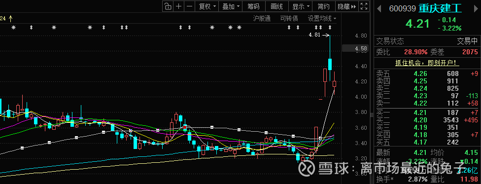 重庆建工:昨日冲击涨停失败,技术面上收出长上影线,虽然今日开盘放量上行,但形态上已积累较多的套牢筹码,还有12亿转债在上方等待,后期以看戏为主。