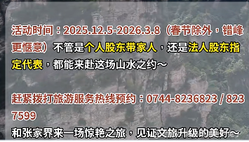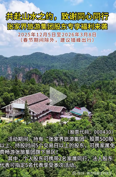 继峨眉山A之后,张家界旅游集团视频号发布公告,在2025年12月5日至2026年3月8日之间,持有*ST张股500股以上,并且持股时间在5个交易日以上的股东,可以携家属畅游张旅旗下景区(2人)