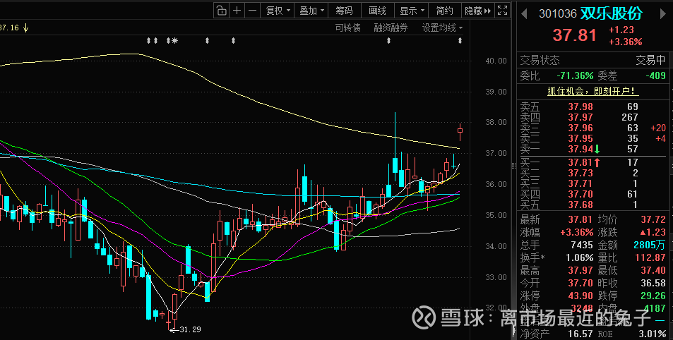 双乐股份总股本仅有1亿,股性十分活跃,在配售资金推动下,股价出现较大的高开,突破年线压制,恭喜持有的DD吃肉,配债不是目的,只是套利的一种方式,稳健者可以逢高离场。